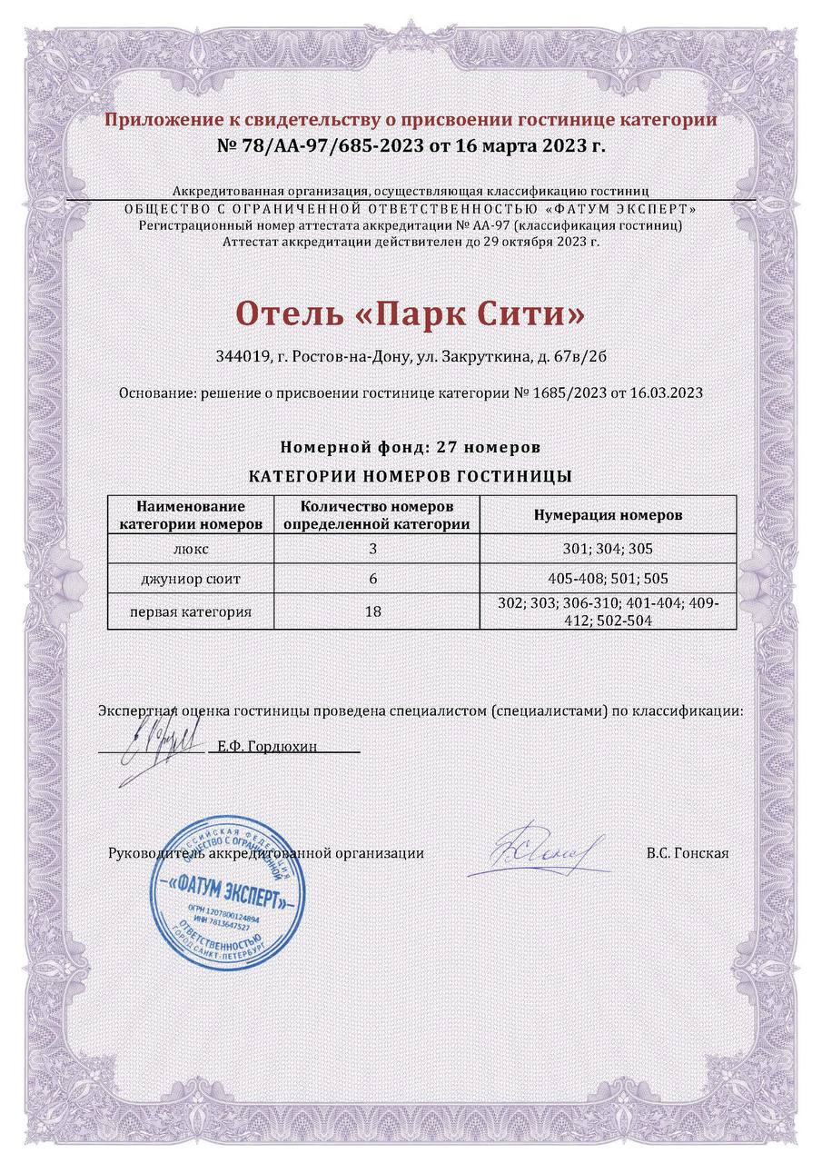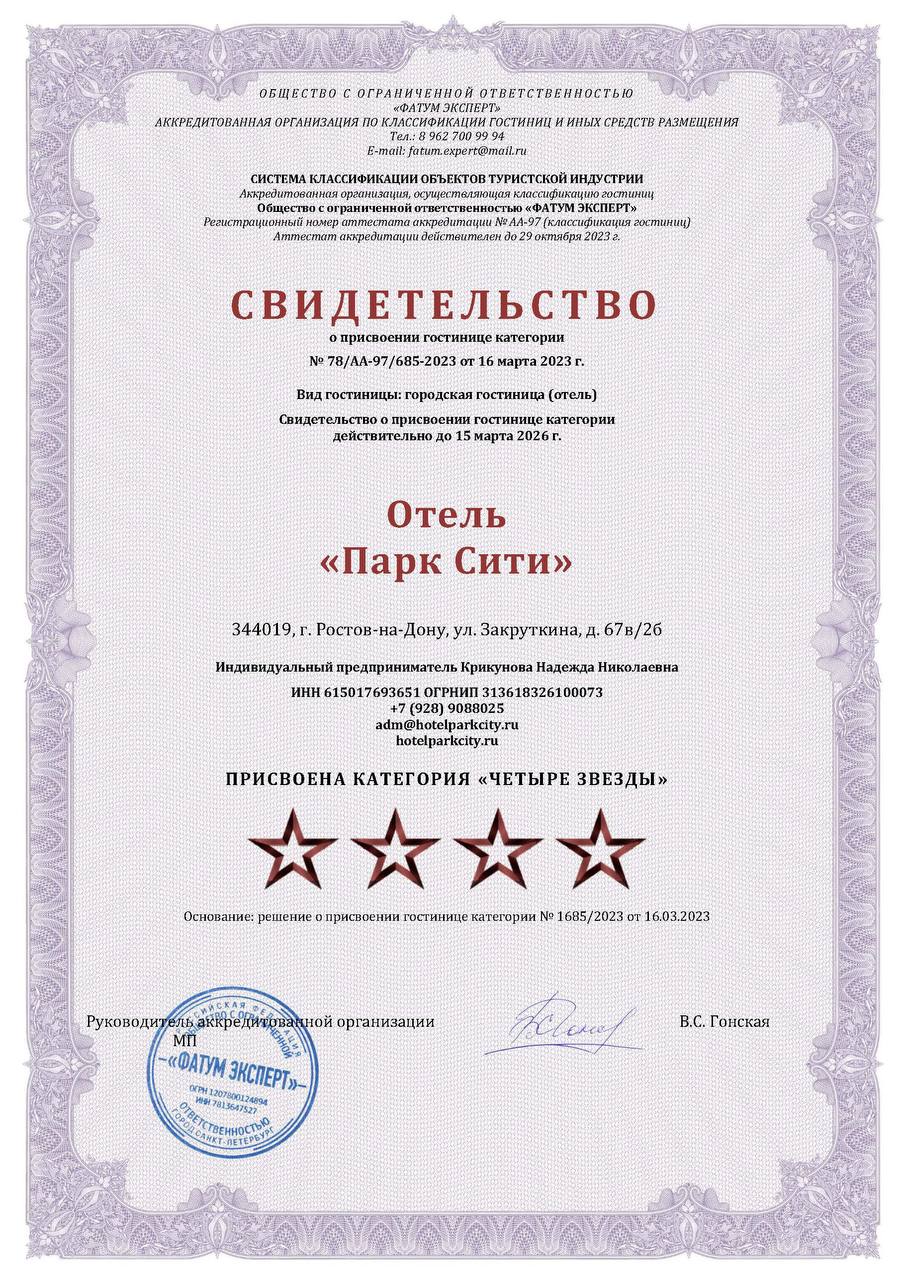 Отелю "Парк Сити" присвоена категория 4 звезды.
